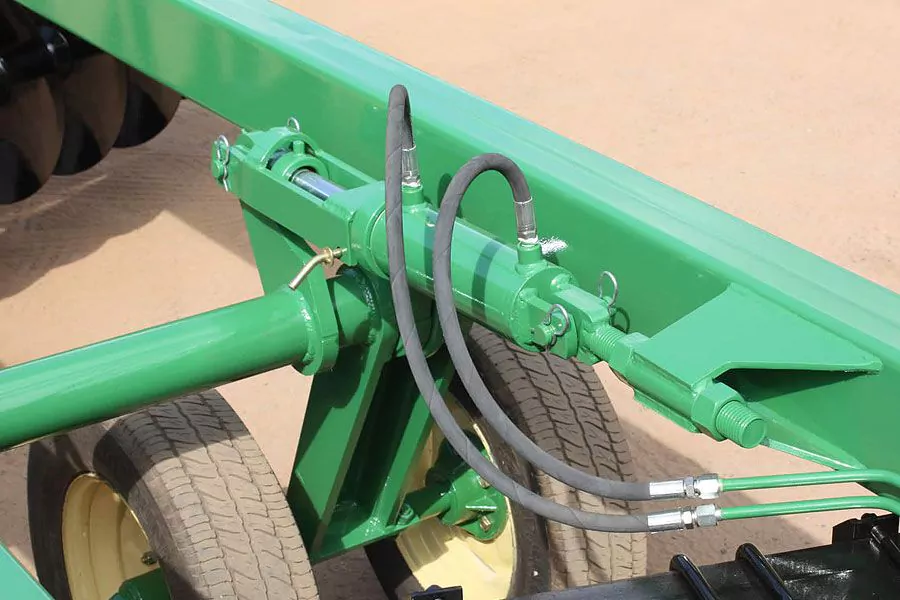 Doble eje vertebrado con ruedas duales. Levante mediante la combinación de dos cilindros hidráulicos incorporados con mangueras hasta el tractor.